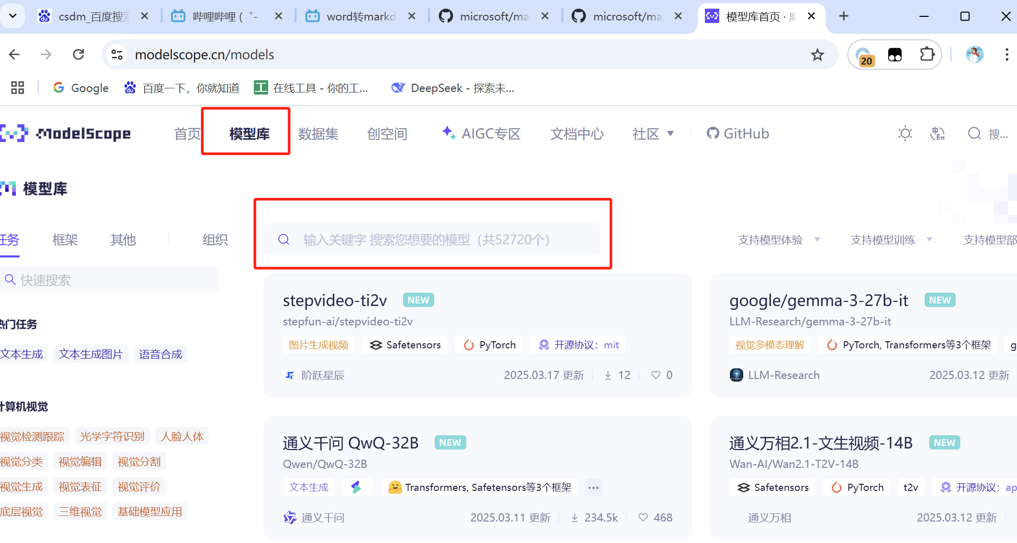 登录魔搭社区https://modelscope.cn/models查找模型