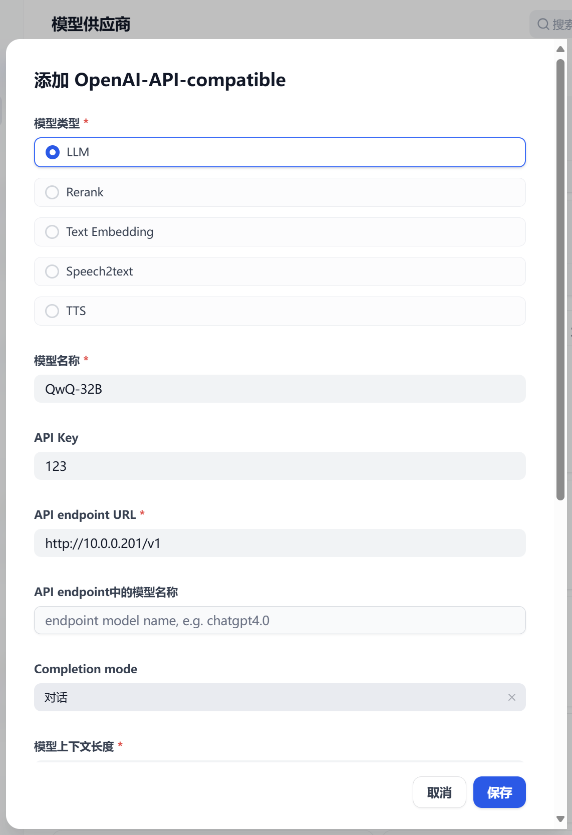 --served-model-name QwQ-32B 为模型指定一个名字,名字随便取,只是用来方便后面Dify进行调用的