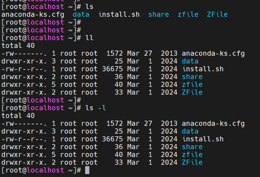 ll 是对ls -l命令的简写,显示文件和目录的详细信息